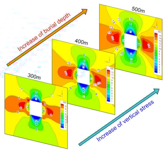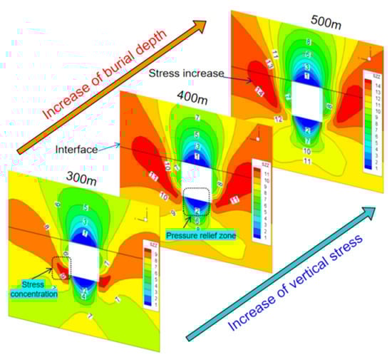 - The stress distribution and deformation of the roadway are closely related to the interface between the coal and rock strata. When there is a coal–rock interface, the vertical stress-concentration area of the sidewall is closer to the floor corner. The slip and dislocation between the coal sidewall and the roof are obvious. The roadway forms a triangular compression area on the floor, and the floor enters the plastic state prematurely. The lateral displacement at the contact between the sidewall and roof is the largest and gradually decreases downward. With the increase of the buried depth, the deformation of the roadway increases gradually, and the difference between the two increases gradually. The maximum wall deformation of coal–rock interface roadway is 1.68 times that of the non-interface roadway.
