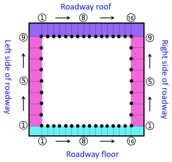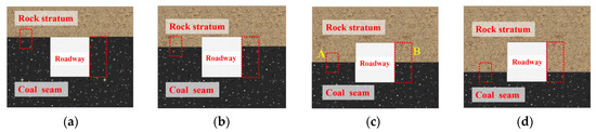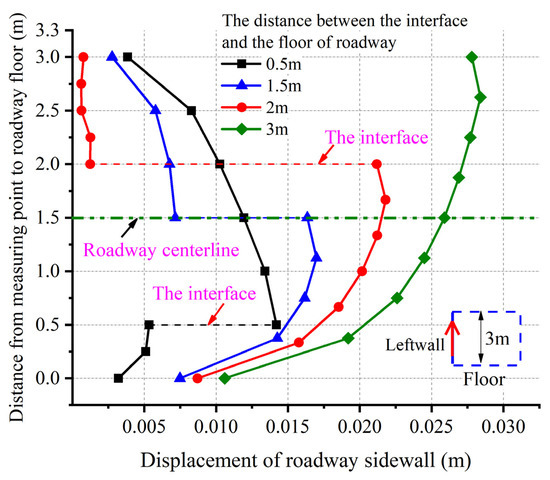 - When the coal–rock interface is 3 m from the roadway floor and is a full seam roadway, the deformation is relatively continuous, and the deformation gradually decreases from the interface to the bottom of the roadway wall. When the coal–rock interface is between the roof and floor of the roadway, the deformation of the rock part of the slope and the coal part has obvious differences. The deformation is discontinuous at the interface, and there is dislocation between the rock stratum and the coal seam.