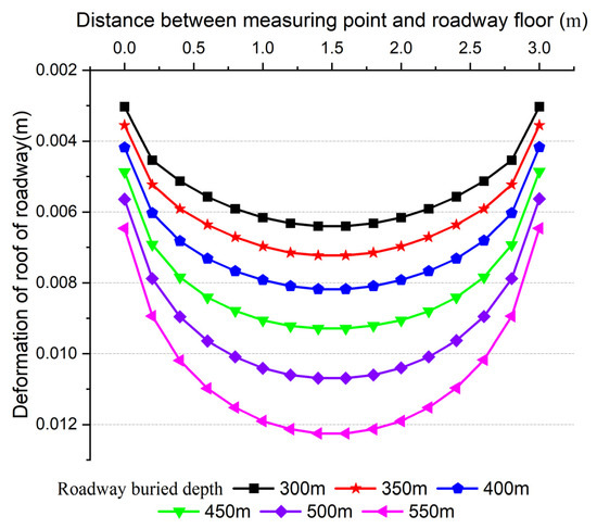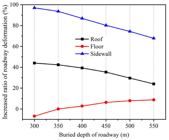 - With the increase of buried depth, the roof and floor deformations of the two roadways increase gradually. When the burial depth is 300 m, the maximum deformation of the roof of the roadway without coal–rock interface is 0.64 cm, the maximum deformation of the floor is 1.13 cm, the maximum deformation of the roof of the roadway with coal–rock interface is 0.09 cm and the maximum deformation of the floor is 1.198 cm. When the buried depth is 550 m, the maximum deformation of the roof of the roadway without coal–rock interface reaches 25.1 cm, and the maximum deformation of the floor is 2.51 cm, which is 1 cm larger than that of the roadway with coal–rock interface.