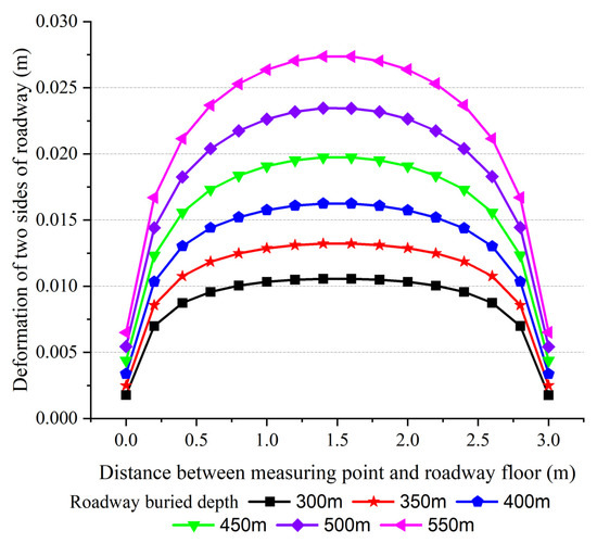 - The displacement of both sides of the roadway is positively correlated with the increase of burial depth. The greater the burial depth is, the greater the deformation of the roadway is. With the increase of burial depth, the displacement of the middle part of the side of the roadway with coal–rock interface gradually increases. Except for the small displacement of the measuring points at the contact with the floor, the displacement of the other measuring points has little difference. In addition, the floor heave occurs during the loading process of the roadway, and the roadway presents the deformation characteristics of the whole side extruding toward the interior of the roadway.