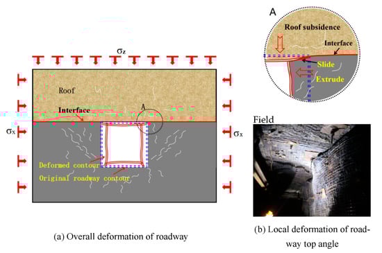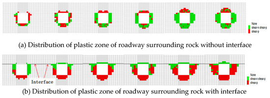 - With or without coal–rock interface, the deformation form of the roadway roof and floor is basically the same. The roof is bulged with a “sag” deformation in the middle, and the bulged “extrusion” deformation in the middle of the floor. The displacement of the roadway roof and the middle of the floor is the largest, and the deformation on both sides is very small.