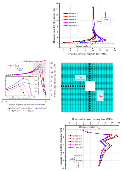 - With the increase of the shear stiffness of the interface, the peak stress of the roadway floor decreases gradually, and the peak point is gradually closer to the roadway bottom. The statistics of peak stress and concentration factor of roadway surrounding rock are shown in Table 2.