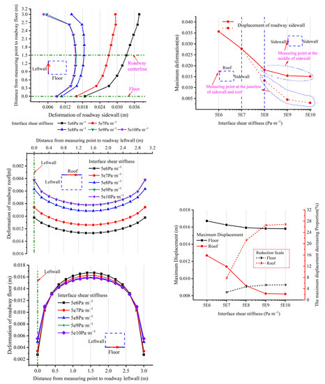 - With the increase of interface stiffness, the displacement of side, floor and roof decreases obviously. The shear stiffness of the coal–rock interface is 5 GPa·m−1, which is the critical value. When the shear stiffness of the interface is less than 5 GPa·m−1, the displacement of the sidewall decreases in a linear form with the increase of the strength of the coal–rock interface. When the stiffness is greater than 5 GPa·m−1, the trend of the displacement reduction decreases.