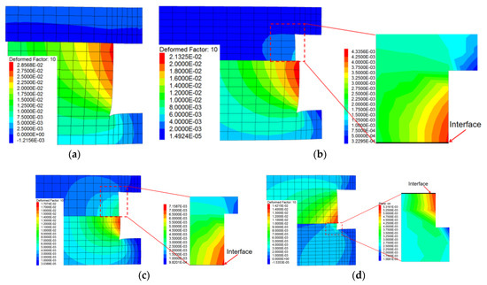 - The interface position has little influence on the deformation of the roadway floor, the maximum deformation value is 0.0162 m~0.0166 m and the deformation shape is basically consistent. As the interface is further away from the roadway floor, that is, the greater the value of a, the deformation of the floor slightly increases, and the deformation of the roof gradually increases, with the maximum deformation between 0.006 m and 0.0114 m. The roof deformation is concave, with the largest deformation in the middle and gradually decreasing toward both ends.