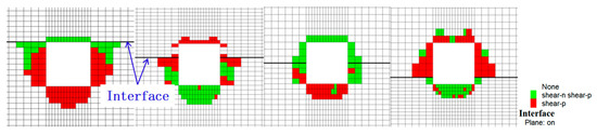 - It can be seen from the deformation nephogram that the coal pillar at the deformed side of the roadway without coal–rock interface is well-connected with the roof, and there is no mutual slip and dislocation. However, the slip and dislocation between the coal pillar and the roof at the deformed side of the roadway with coal–rock interface is evident. When the burial depth is large, the side appears to extrude into the roadway as a whole. The roadway forms a triangle extrusion area on the floor, the floor heave range is larger, the floor enters the plastic state prematurely and the maximum deformation of the floor continues to increase.