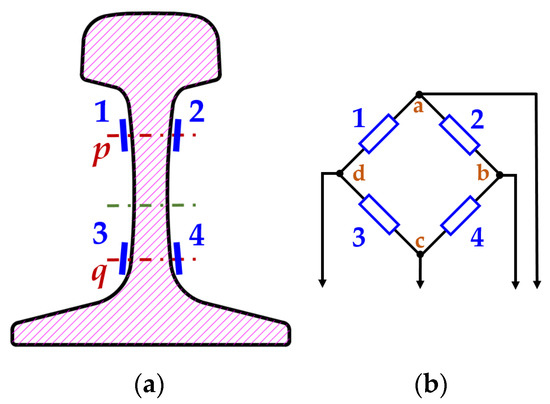 Resistance strain gauge layout (a) and connection scheme (b) for lateral force measurement using the Schlumpf method. Points a, c—measurement diagonals; d, b—bridge feed; 1, 2, 3, 4—reference numbers of the resistance strain gauges in sections p and q.
