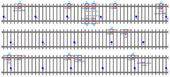 Schematic sensors on the track and a diagram of rolling stock: E—sensors for measuring stresses at the edges of the rail foot; P—sensors for measuring vertical forces; Y—sensors for measuring lateral forces according to the three-point method; S—sensors for measuring lateral forces under the Schlumpf method; L—sensors for measuring longitudinal forces; blue points—the determined positions of the wheels of the rolling stock.
