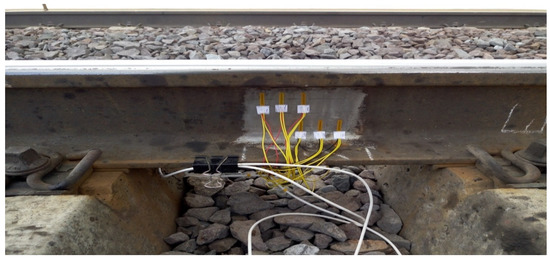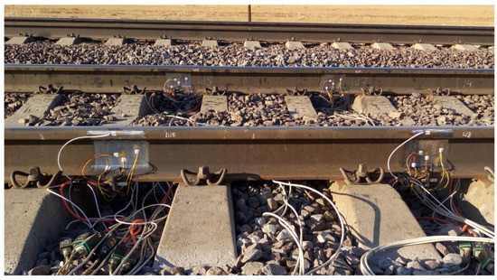 Resistance strain gauge schemes installed on the rail track and depicted in Figure 1 were used to measure the dynamic vertical forces exerted by the wheels of the rolling stock on the rails. Resistance strain gauges 1–2 were installed in pairs on the rail web on the inner and outer sides of the rail, at the level of the neutral axis of the rail in the rail section of interest. The required number of rail sections to measure the vertical forces was determined by using the respective software application and testing methodology. The general rule was that the minimum number of sections was 8 for the turnouts and 16 for other tested spans [69].