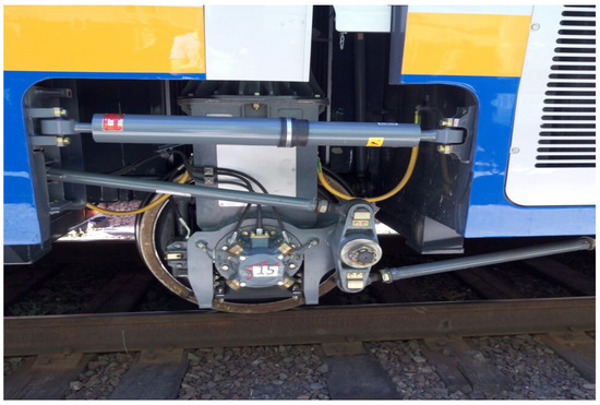 The investigated time of the rolling stock truck had the lowest number of random factors that influenced the value of the dynamic forces exerted by the truck wheels on the rail. This was related to the single-axle type of truck (Figure 6) used; that is, the influence of a single force was considered. Moreover, the truck structure restrained the swaying motion as the truck was a tilting train-type truck. Therefore, the possibility of dynamic increases due to the effect of the wheels of neighboring trucks was ruled out, and the deviation range of the dynamic increases related to the values of the direction of the force during movement was restricted. The dimension of the direction of the force from the wheels to the rails was related to several factors.