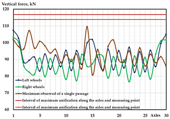 Figure 7 shows (i) the values of vertical forces obtained during the wagon wheel weighing; (ii) the values registered for one of the passages of the rolling stock through the defined zone; and (iii) the interval of the maximum values observed during the unification of data for all axes and points of measurement during all the passages at the same speed as a single passage. It should be noted that two samples were automatically formed during the sampling: one sample for loaded wheels, and another for unloaded wheels. As a result, two values of the maximum observed dimensions were obtained.