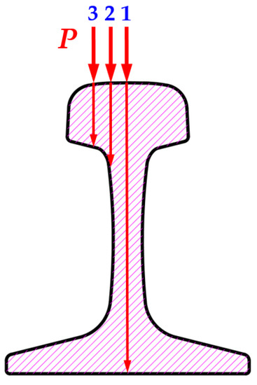 Thus, in the same direction of the influence of external vertical force displaced transversally to the rail head, the influence of the force inside the rail may reach the following three surfaces: (1) rail base, (2) rail web, and (3) rail head (Figure 9).