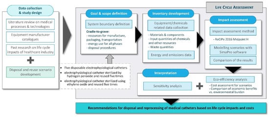 Based on the above literature review, the scope of the study was defined to compare and assess the relative benefits of reprocessing and reusing electrophysiological catheters instead of taking a single-use approach. The number of reuse turns was set at five, based on the findings of previous research that the insulation degraded after five turns in hydrogen peroxide sterilization [15]. A life cycle assessment and a life cycle costing were carried out for different disposal, sterilization, and reuse scenarios as described in the following sections. The overall methodology is summarized in Figure 1.