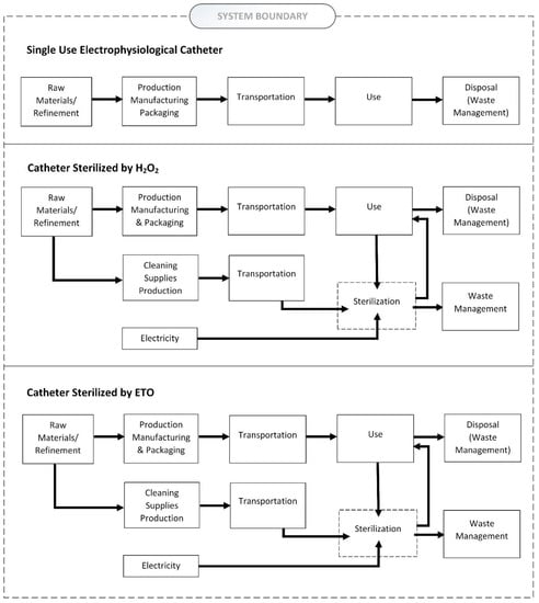 An LCA was performed to compare the environmental impacts of five disposable electrophysiological catheters: an electrophysiological catheter sterilized by hydrogen peroxide and reused five times and an electrophysiological catheter sterilized using ethylene oxide and reused five times. As such, the functional unit of this study was “the use of electrophysiological catheters five times”, which corresponds to both using a new catheter each time and to disinfecting and reusing an electrophysiological catheter five times with a sterilization method. The hydrogen peroxide sterilization process followed that of the STERRAD 100NX sterilizer, while the ETO sterilization process followed that of the 3MTM Steri-VacTM Sterilizer/Abator GS Series. As such, all inputs and wastes were chosen and calculated using the descriptions of these two disinfection processes.