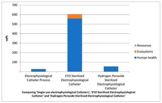 The results seem to indicate that from a purely environmental perspective, employing disposable electrophysiological catheters does not have much of a positive outcome. As mentioned before, single-use electrophysiological catheters had the lowest environmental impact in every category except land use, in which hydrogen peroxide sterilization had the lowest impact. This might be due to the fact that more resources are necessary to produce five new catheters than are necessary to disinfect one catheter. However, surprisingly, using ETO to sterilize the electrophysiological catheters had the highest environmental impact in every category considered. This is partially attributable to the fact that a significant amount of electricity is consumed in every ETO sterilization cycle. These extended cycle times in turn are necessary because of the toxicity of the residual quantities of ETO; the lengthy aeration periods are needed so that enough ETO dissipates before the next use. Furthermore, because ETO is a toxic compound proven to be a carcinogen, an additional apparatus is needed for detoxification in order to convert any remaining ETO to carbon dioxide and water. This instrument too required electricity to operate. The hydrogen peroxide disinfection scenario also consumes energy and chemicals for the disinfection process. However, due to the lower toxicity compared to ETO, there is no need for such a stringent detoxification process. This means that the disinfection-process-related impacts are lower in hydrogen peroxide sterilization.
