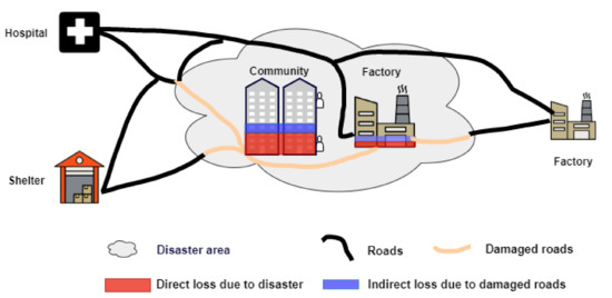 Impacts due to natural hazards and damaged roads. In the disaster area (grey), the community and factory will be affected immediately when the disaster occurs (red presents direct loss for the community and factory due to a disaster). After the disaster, indirect losses may occur since aggravated injury due to untimely rescue and supply to the disaster area is hampered (blue is the indirect loss for the community and factory due to damaged roads).