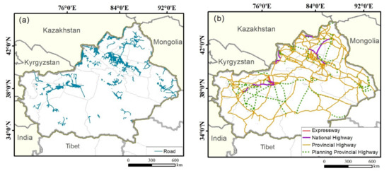 (a) Highway infrastructure of the XPCC and (b) the existing and planned arterial highway networks of the XPCC.