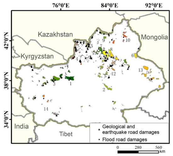 Geological hazards, floods, earthquakes and snow are the four major natural hazards faced by the XPCC highways [23]. As the XPCC does not have highway damage records concerning snow, we only selected geological disasters, floods, and earthquakes for our analysis.