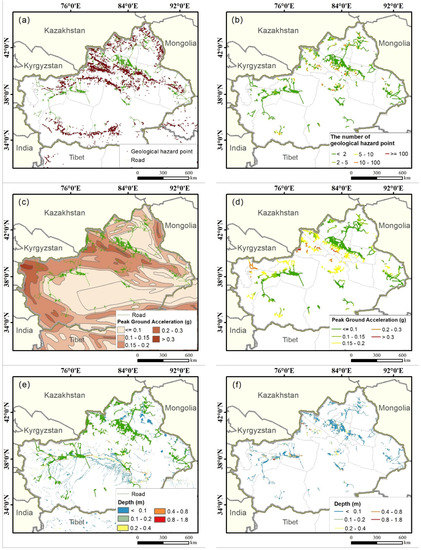 (a) The spatial distribution of the geological hazard points, (b) geological exposure map of the highway, (c) the spatial distribution of earthquakes, (d) earthquake exposure map of the highway, (e) the spatial distribution of floods, and (f) flood exposure map of the highway.