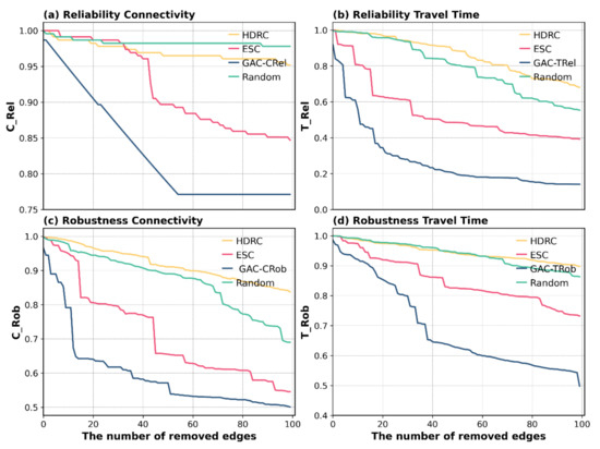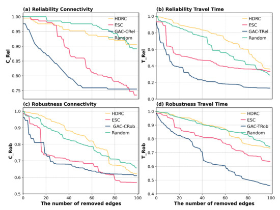 Concerning the attack strategies, we found that the ESC attack strategy had a higher destruction capability than the random attack strategy, which was close to the GAC strategy. In addition, attacks had a negligible impact on connectivity reliability and robustness, but they greatly affected travel time reliability and robustness.