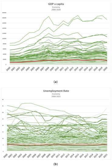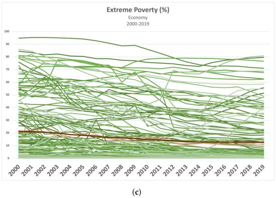 Overview of the considered economic indicators. Green lines represent the values associated with single countries, while the red line shows the average value. (a) GDP × capita [44]; (b) Unemployment Rate [45]; (c) Extreme Poverty (computations based on [46]).