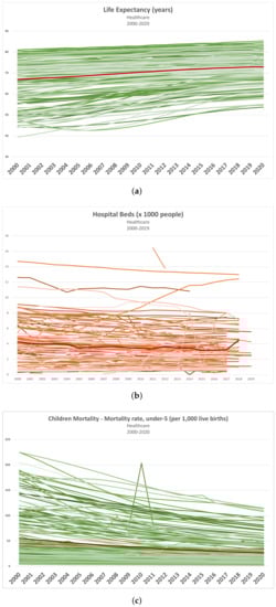 The healthcare category includes currently three different indicators: Life Expectancy, Children Mortality and Hospital Beds. While the first two indicators aim to provide a very generic assessment of healthcare in a given country in context, the number of hospital beds available pretends to measure, always in very generic terms, the capability of the healthcare infrastructure as in other studies [57]. Currently available data are reported in Figure 3a–c. Unfortunately, the indicator related to hospital beds is available for a relatively limited number of countries and presents a significant amount of missing data.