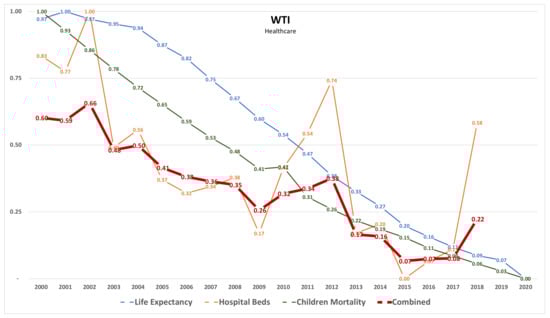 WTI—Healthcare. It results from computations on the raw data reported in Figure 3. The combined value is the average of the WTI for the different indicators.