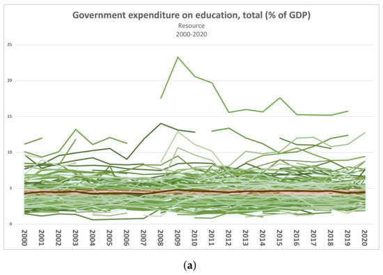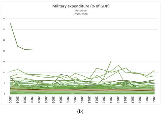 Overview of the considered indicators in the category Resource. Green lines represent the values associated with single countries, while the red line shows the average value. (a) Expenditure on education [51]; (b) Military expenditure [50].