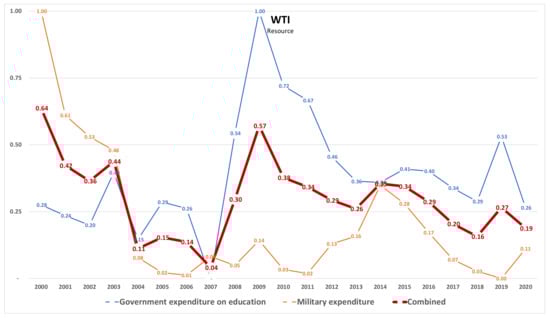 The interpretation of WTI for this category is much less linear than for the previously proposed ones. Indeed, in an ideal case, we would like, first of all, to appreciate a clear decrease of military expenditure and a large increase in social investment. An alignment of purpose (decreasing WTI) would be an additional indicator of a growth in the right direction. Currently, the first condition is not clearly reflected in numbers, so the positive trend of WTI is probably less relevant than in other categories.