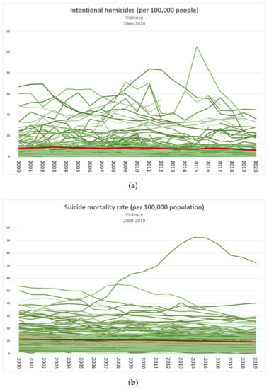 Overview of the considered indicators in the category Violence. Green lines represent the values associated with single countries, while the red line shows the average value. (a) Intentional homicides [52]; (b) Suicide mortality rate [53].