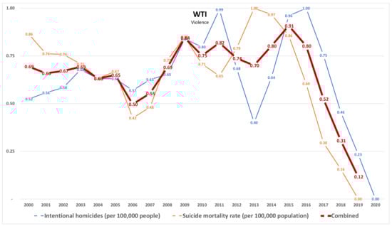 WTI—Violence. It results from computations on the raw data reported in Figure 7. The combined value is the average of the WTI for the different indicators.