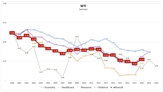 A summary of the computation results is proposed in Figure 9, which reports the average value of WTI for each considered category. As previously discussed, all categories present a relatively consolidated trend pointing to a fundamental reduction of inequality. This pattern is clearly visible looking at the average value among the different categories (“Overall” in the figure).