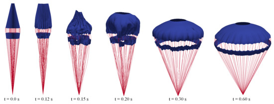 - Boustani, J.; Barad, M.F.; Kiris, C.C.; Brehm, C. Fully-coupled fluid-structure interaction simulations of a supersonic parachute. In Proceedings of the AIAA Aviation 2019 Forum, Dallas, TX, USA, 17–21 June 2019. [Google Scholar]