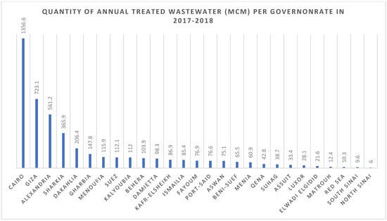 Quantity of annual treated wastewater in Egypt per governorate (CAPMASS 2017–2018) [13].