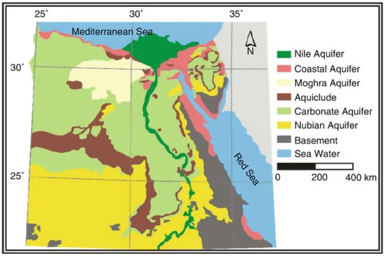 The pressure on Egypt’s limited water supplies has increased due to the country’s growing industrial and agricultural sectors as well as its growing population. The supply of water is now almost at capacity. However, the Nile’s water supply has not increased, and there are still very few alternatives for additional supplies [1]. The annual budget for renewable fresh water in Egypt (i.e., Nile River and rainfall) as estimated in 2017 was around 56.8 billion m3. About 55.5 billion m3 of this budget is provided by the river Nile and about 1.3 billion m3 comes from rainfall. On the other hand, non-renewable groundwater systems are considered the second water source [2] and contribute about 10 billion m3 of Egypt’s total annual water budget [3]. Egypt uses more than 78 billion m3 of water annually, leaving a shortfall of about 20 billion m3 each year. The agricultural sector in Egypt uses 80% of the country’s water budget, while the domestic and industrial sectors use no more than 20%. In the last three decades, the proportion of fresh renewable water per person has decreased dramatically, falling below the international critical limit of 1000 m3/person/year. Thus, the country is transitioning from a situation of water stress to a state of water scarcity [1].