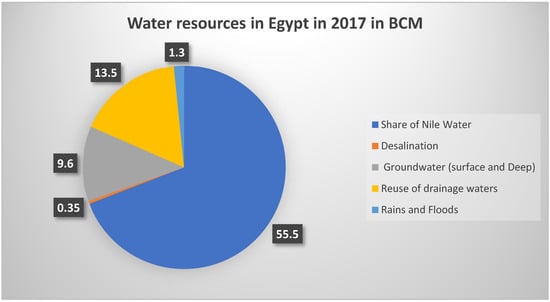 Figure 3 shows the quantities of various water resources and uses in Egypt during 2017. Data from the Ministry of Water Resources and Irrigation (MWRI) [3] indicate that agricultural drainage recycling produced 13.5 BCM in 2017, while the groundwater systems contributed with 9.6 BCM.