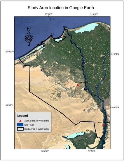 - Hani, H.M.; Nour El Din, M.M.; Khalifa, A.; Elalfy, E. Development of Suitability Map for Managed Aquifer Recharge: Case Study; West Delta: Cairo, Egypt, 2023. [Google Scholar]