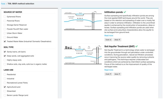 By applying the above conditions to the data-driven selection tool, it reveals that infiltration basins or spreading methods seem to be the best options to recharge treated wastewater (Figure 6). The spreading methods technique tends to enhance the treated effluent in the soil using a natural technique known as soil aquifer treatment (SAT). The application of spreading methods techniques also tends to prevent and avoid potential clogging issues, which are common in recharge with injection wells and are also challenging to solve or redevelop [31].