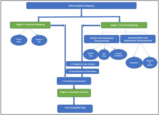The second stage is followed by a sensitivity analysis which represents the third stage in MAR suitability mapping development. The sensitivity analysis is carried out to determine how robust the results are. The selected criteria and defined weights are the primary sources of uncertainty in GIS-MCDA [19]. If the sensitivity analysis reveals highly sensitive criteria, the deterministic approach to MAR suitability mapping may be changed to a probabilistic approach. The following section discusses the specifics of each stage during the development of the suitability map, as well as the main outputs of each stage.