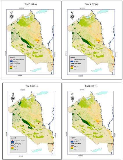 The literature describes a variety of approaches for sensitivity analysis in GIS-MCDA [18]. One method is to reassign criterion values. This approach is adopted in the current investigation where the weights of the criteria are systematically adjusted by increments (+10%, −10%), with impacts on dynamic interlinkages between the selected criteria assessed. To come up with the new suitability analysis equations, the weight of each parameter from the six criteria described in the methodology is increased once by 10%, then reduced once by −10% while maintaining the total sum of the weights in the equation equal to 100. For each trial, the model of the suitability analysis is recalculated to obtain the effect of each layer (criterion) on the modeling results. By modifying the weights of the criteria, the sensitivity analysis assumes that the weights are the primary source of uncertainty and hence concentrates on a one-dimensional sensitivity analysis.