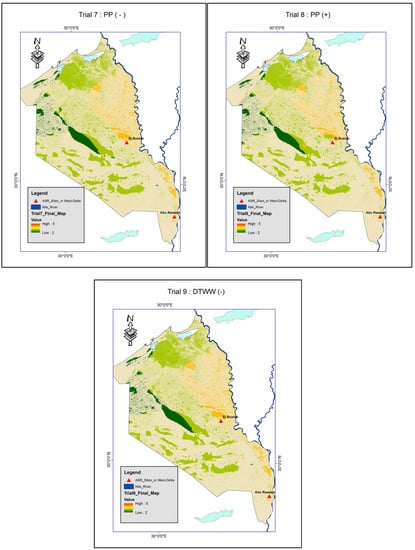 The cohort-component technique is used to generate the predicted population estimates in the Spectrum 5 model. The initial input data for this model is based on CAPMAS population estimations produced in 2013 [37]. Based on these forecasts, a standard suitability index is constructed to identify high-suitability recharge locations that accounted for the largest predicted population rates. The following figures (Figure 9 and Figure 10) illustrate the standardization of the remaining parameters according to the determined scale for the West Delta case study.