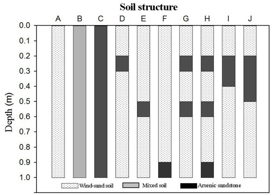 The experiment was conducted in 2019. Ten soil configurations were prepared, and the specific parameters of each configuration are shown in Figure 1. Treatments A, B, and C were the three types of homogeneous soils: sandy soil, montmorillonite-enriched sandstone, and sandy-montmorillonite-enriched sandstone mixture (3:1 mixing ratio), respectively; treatments D–F were layered soil models with 10 cm montmorillonite-enriched sandstone layers at the depth of 20–30, 50–60, and 90–100 cm, respectively, while the rest of the layers were sandy soils; treatment G had two layers (at the height of 20–30 and 50–60 cm) of montmorillonite-enriched sandstone; treatment H had three layers of montmorillonite-enriched sandstone at 20–30, 50–60, and 90–100 cm. For the treatments I and J, 20 and 30 cm thick montmorillonite-enriched sandstone was set at the depths of 20–40 cm and 20–50 cm, respectively. Each treatment was replicated five times. Homogeneous treatments A–C were used to test the effect of soil texture, layered treatments D–J to assess the effect of the location, quantity, and thickness of the montmorillonite-enriched sandstone layer on plant growth, and a 20 cm layer of sandy soil on the upper surface of the layered soil to increase the water infiltration rate and reduce the cumulative evaporation of soil water.
