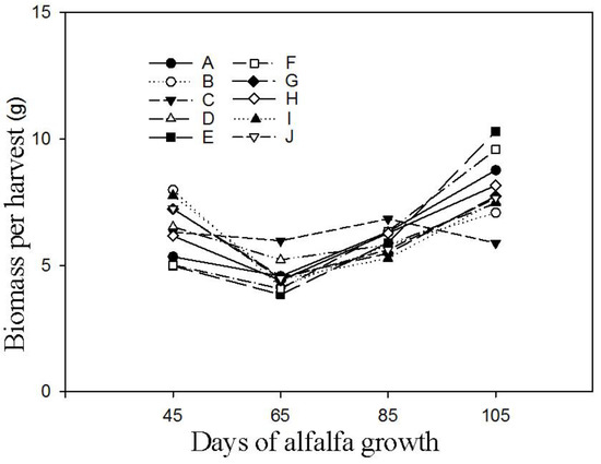 Above-ground biomass of alfalfa in treatments A, B, C, D, E, F, G, H, I, and J.