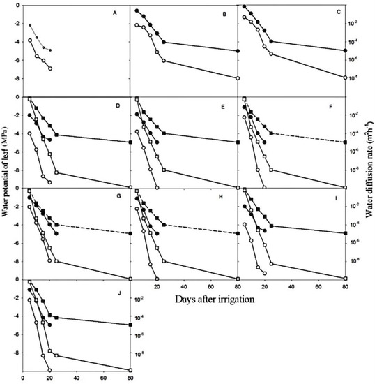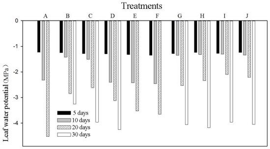 Change in leaf water potential with time in treatments (A–J).