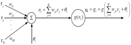 The inputs to the neuron, xj (j = 1,2,…, K), are multiplied by the weights WKi and are added to the constant bias term θi. The resulting ni is the input to the activation function g. The output of neuron i thus becomes: