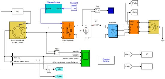 A composite load model was constructed using MATLAB/Simulink software. The implemented model comprised a 50 HP, 460 V, 60 Hz induction motor, a speed controller to control the motor’s speed, an IGBT inverter, and a rectifier. The load torque connected to the motor was a function of the rotor speed. The constructed Simulink model depicted in Figure 3 shows all components used.