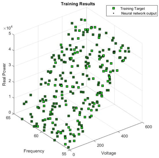 The model shown was simulated for voltages and frequencies in the 0−550 V and 55−65 Hz range, respectively. The active and reactive powers at the load terminal were computed and recorded for each set of voltages and frequencies. All data points were used in training and validation, as discussed in the next section. A sample of the simulated results is provided in Table 1.