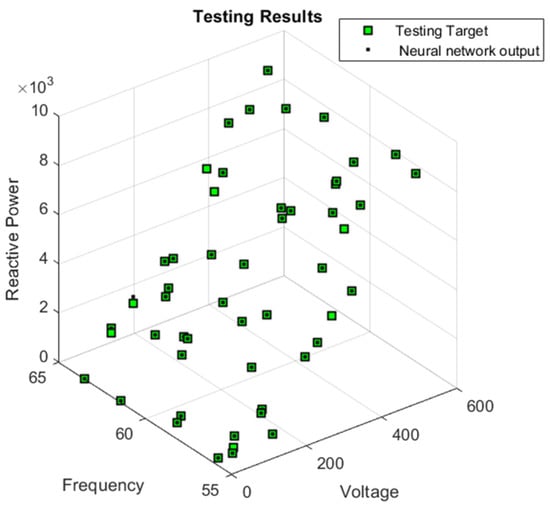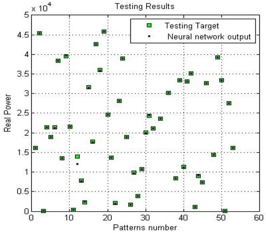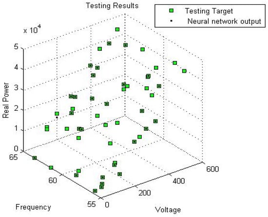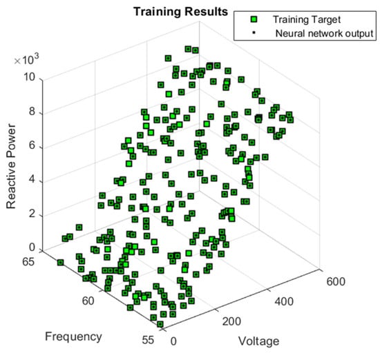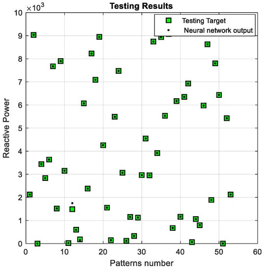 After both networks were trained, selected input data were fed into each network. The comparisons between the neural network outputs and the actual output data for real power are shown in Figure 6 and Figure 7, where these are depicted as black dots and green squares, respectively. The neural network for reactive power was also tested after training using 250 data points, as shown in Figure 8 and Figure 9, where the green points represent the target outputs of the tests, and the black points represent the actual outputs of the system.