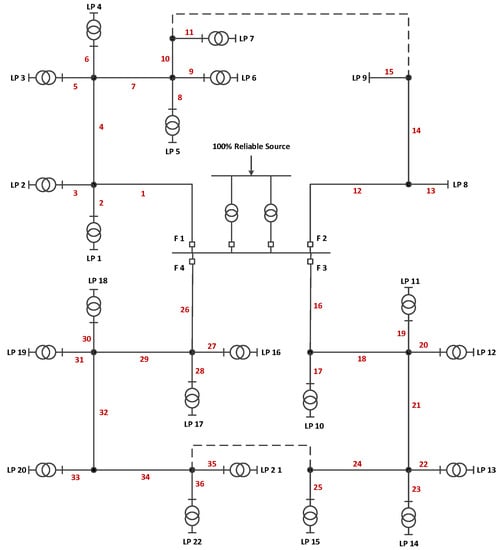 This particular distribution system configuration was considered because, due to the system’s complexity, availabilities of a significant number of components exert a direct effect on its overall reliability. In addition, all customer loads of various load types are connected to the system at the distribution level. For accurate reliability analysis and index calculation, the effects of all components on the availability of the power system must be included because neglecting some aspect of the actual physical behavior of any component in the network will result in underestimating the reliability indices. Traditional reliability indices were used to verify the impact of the load model type on the determined network and customer performance. The failure rate (λ) and repair time for each component are given in Table 5 and were used to calculate the reliability indices for the entire system, namely SAIFI, SAIDI, CAIDI, ASAI, and ENS.