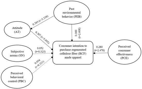 Specifically, U.S. consumers’ attitude toward environmentally friendly apparel positively affects their purchase intention for RCF-made apparel (β = 0.307, t = 5.892), supporting H1. U.S. consumers who perceive the consumption of environmentally friendly apparel as a way of environmental protection are more likely to purchase RCF-made apparel. This finding meshes with previous findings on the relationship between consumers’ attitude and purchase intention toward environmentally friendly products from Chi et al. [8], Zheng and Chi [21], and Nam et al. [29]. However, subjective norm (SN) does not significantly influence U.S. consumers’ purchase intention toward RCF-made apparel (β = 0.052, t = 0.323), not supporting H2. This indicates that significant others’ opinions do not decide U.S. consumers’ willingness to buy RCF-made apparel. This seems to support the notion that consumers are willing to hear others’ opinions but make their own decisions [33,39]. Similarly, perceived behavioral control (PBC) does not significantly affect U.S. consumers’ intent to purchase RCF-made apparel (β = 0.054, t = 0.321), not supporting H3. This reveals that having the resources and ability to acquire environmentally friendly apparel is not a major concern for U.S. consumers to purchase RCF-made apparel. In contrast, perceived consumer effectiveness (PCE) significantly affects U.S. consumers’ purchase intention toward RCF-made apparel (β = 0.309, t = 2.478), supporting H4. This finding is aligned with the previous studies that have reported individuals’ belief of their positive behavioral impact on the environmental protection as one of most influential predictors for consumers’ purchase and consumption of green products [8,39,61].