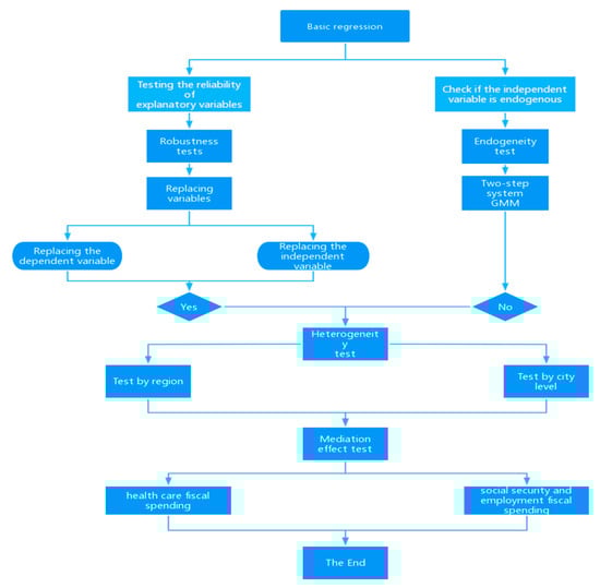 In this paper, we first performed a basic regression. Although the basic regression passed the significance test, there may be problems with unscientific variable indicators and endogeneity, so we performed robustness tests (replacing the dependent and independent variables) and two-step systematic GMM tests, respectively. After passing the robustness test and eliminating endogeneity, there may still be heterogeneity problems, so we performed heterogeneity tests at the region and city levels. After passing the heterogeneity test, there may still be a problem that the mechanism of the role between population aging and fiscal sustainability is unknown, so we analyzed the mediation effect of social security fiscal spending and health fiscal spending in depth. At this point, the empirical analysis is scientific, robust, and complete. The empirical analysis is concluded. The specific process is shown in Figure 1.